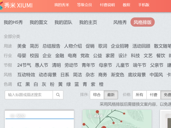 点击上方橙色菜单栏“我的秀米”,再点击“风格排版”即可看到不同风格的模板。